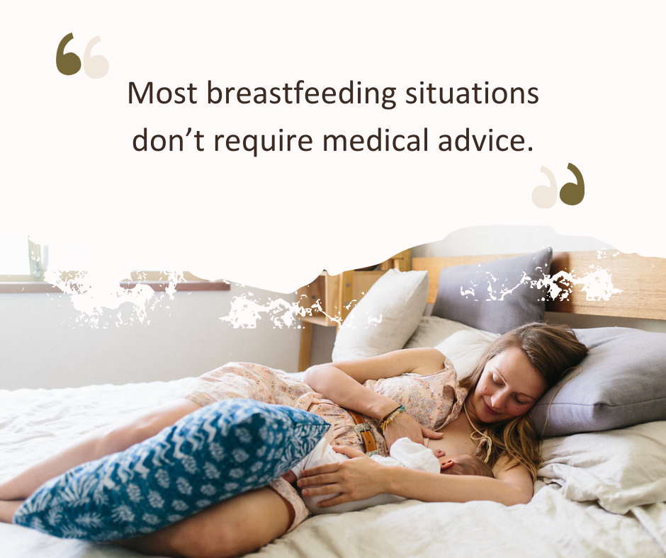 However, most breastfeeding situations don’t require medical advice. The majority of the breastfeeding problems the typical professional comes across can be solved by adjusting positioning or latch, providing resources, or even just reassuring the parent that things are normal.